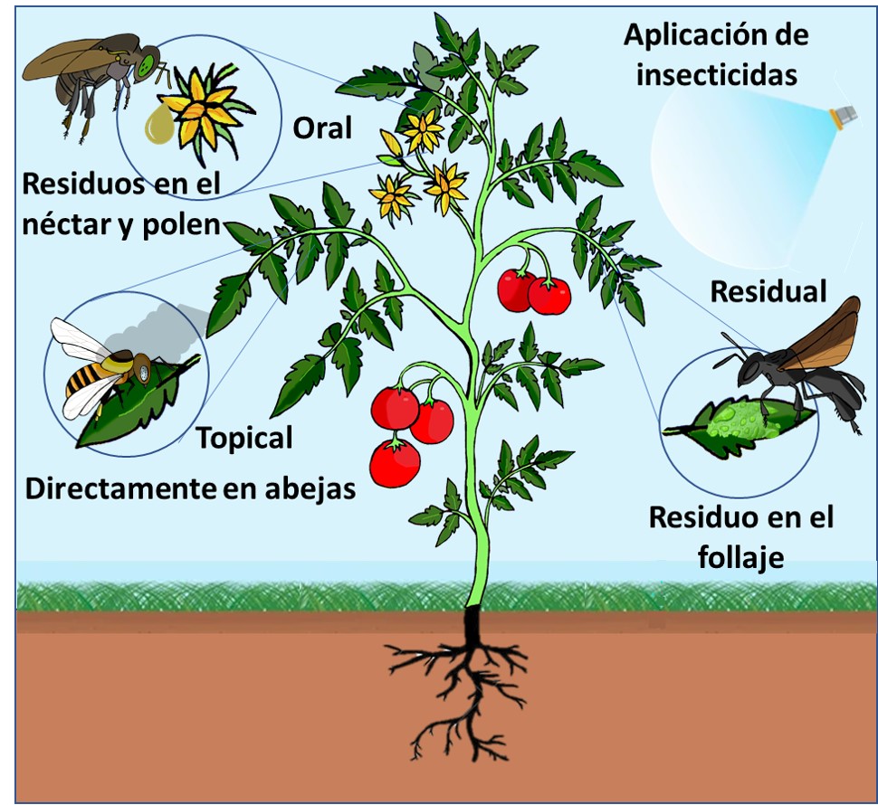 En los neotrópicos, las abejas sin aguijón coexisten con plagas vegetales en los agroecosistemas. El uso de insecticidas químicos usados para controlar insectos chupa-savia puede suponer un riesgo para las comunidades de abejas sin aguijón. Para obtener una visión del posible riesgo de los insecticidas comúnmente utilizados por agricultores en cultivos hortícolas, evaluamos en condiciones de laboratorio los efectos de la exposición oral a cinco insecticidas en la supervivencia de dos especies de abejas sin aguijón, Nannotrigona perilampoides y Frieseomelitta nigra. Los resultados mostraron que algunos insecticidas tienen un impacto negativo significativo en la supervivencia de las abejas sin aguijón en condiciones de laboratorio. Estos resultados sugieren que las abejas sin aguijón pueden verse afectadas negativamente al recolectar flores de cultivos tratados con insecticidas.