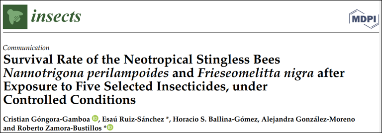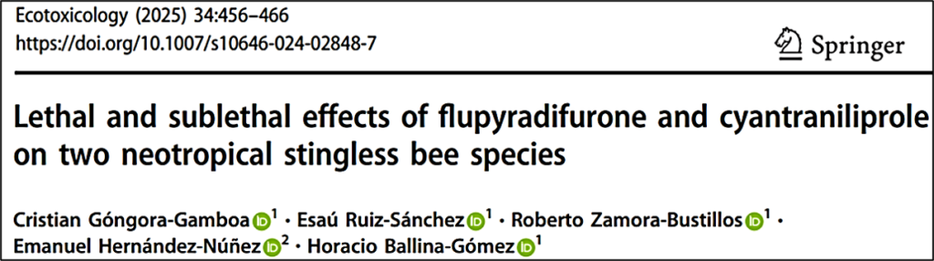 Las abejas sin aguijón son polinizadores importantes en regiones tropicales, pero su supervivencia y comportamiento pueden verse afectados por los insecticidas. En este estudio se evaluaron los efectos letales y subletales de dos insecticidas (flupyradifurone y cyantraniliprole) en dos especies de abejas sin aguijón: Melipona beecheii y Nannotrigona perilampoides. Los resultados mostraron que M. beecheii fue más sensible a ambos insecticidas que N. perilampoides y que el flupyradifurone actuó más rápido en causar la muerte. Incluso a concentraciones no letales, ambos insecticidas redujeron la velocidad de caminata y afectaron la capacidad de las abejas para despegar en vuelo. Este trabajo es la primera evaluación completa de estos efectos en ambas especies y aporta información importante sobre el impacto de estos insecticidas en las abejas sin aguijón.