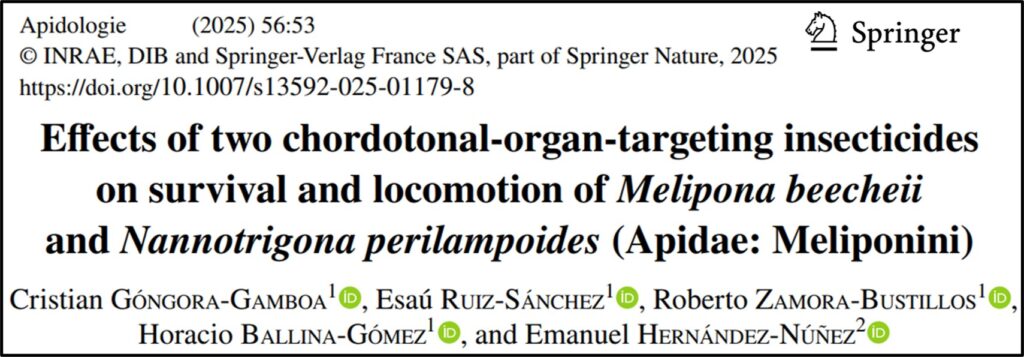 Los órganos cordotonales son esenciales para que los insectos puedan orientarse, comunicarse y detectar amenazas. Sin embargo, se sabe poco sobre cómo afectan los insecticidas que actúan sobre estos órganos a las abejas sin aguijón. En este estudio se evaluó la toxicidad de dos de estos insecticidas (flonicamid y pymetrozine) en Melipona beecheii y Nannotrigona perilampoides, mediante exposición oral y por contacto. Los resultados mostraron que M. beecheii fue más vulnerable que N. perilampoides, y que la exposición oral fue más dañina que la de contacto. La supervivencia disminuyó notablemente, especialmente en M. beecheii. Además, ambos insecticidas redujeron significativamente la velocidad de caminata y casi eliminaron la capacidad de vuelo en las dos especies. Estos hallazgos demuestran que las abejas sin aguijón son altamente sensibles a estos insecticidas y resaltan la necesidad de regulaciones más estrictas para proteger a los polinizadores.