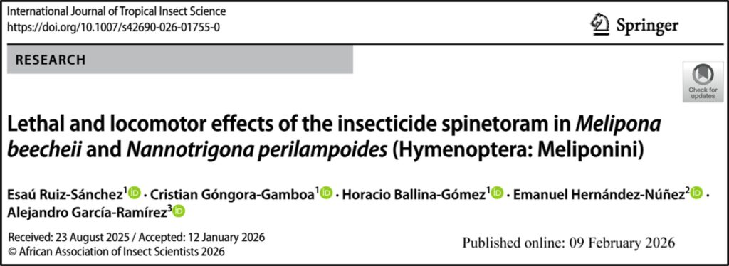El uso de plaguicidas agrícolas es uno de los principales factores asociados a la disminución global de las poblaciones de abejas. En este estudio se evaluaron los efectos letales y subletales del insecticida spinetoram en dos especies de abejas sin aguijón, Melipona beecheii y Nannotrigona perilampoides. Los resultados mostraron que, a la dosis recomendada en campo, el spinetoram causó la muerte del 100% de las abejas en pocas horas. Incluso a concentraciones diluidas, se observaron altos niveles de mortalidad y una reducción significativa en la velocidad de caminata, un indicador clave del desempeño comportamental. Además, se detectaron diferencias en la sensibilidad entre especies, siendo M. beecheii la más afectada. Estos hallazgos evidencian que el spinetoram representa un riesgo importante para las abejas sin aguijón y subrayan la necesidad de considerar a los polinizadores nativos neotropicales en las evaluaciones de riesgo de plaguicidas.